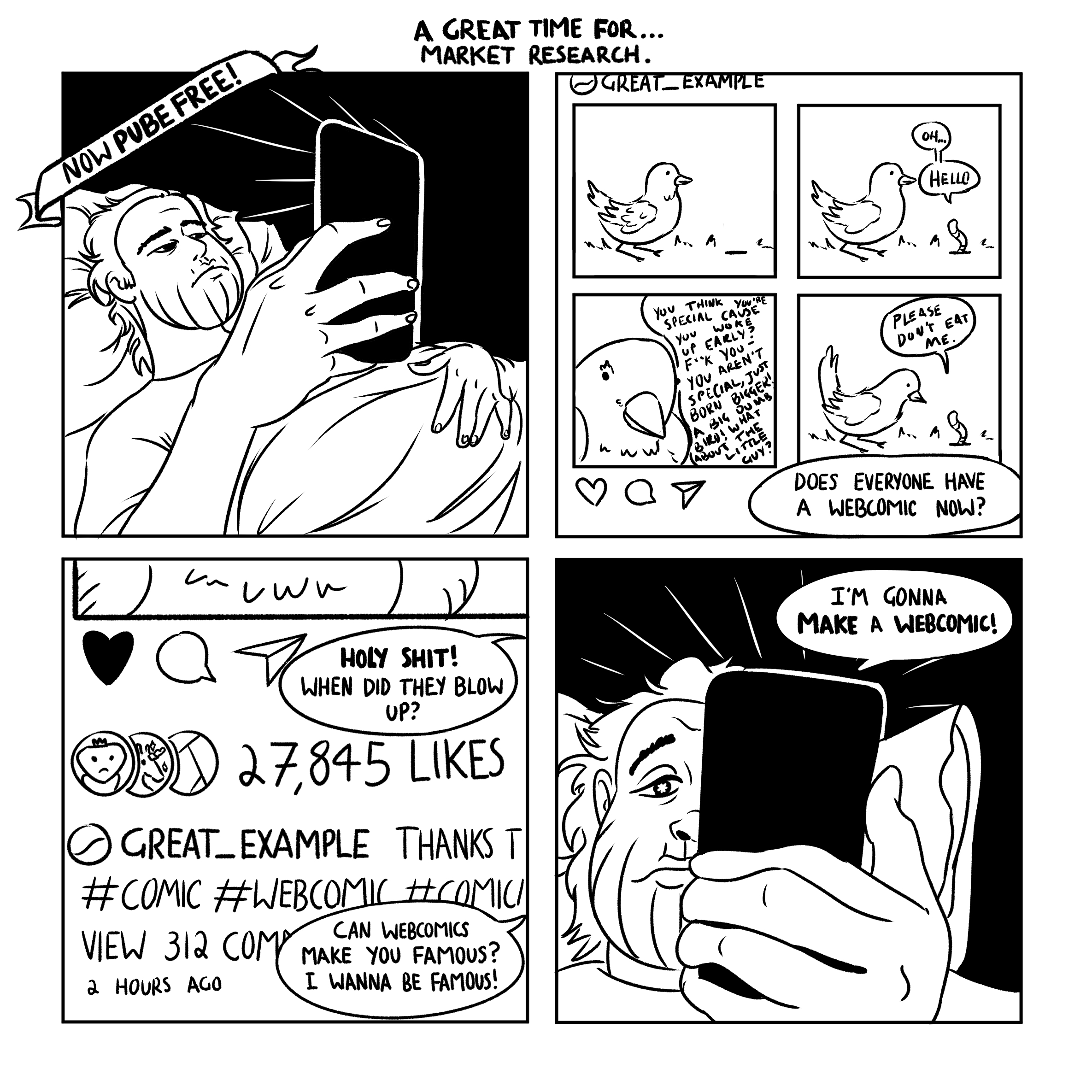 A short (unfinished) webcomic that was for my thesis project for my master’s. Its a semi-autobiographical recounting of going into lockdown, mental health and wanting to make a webcomic to be famous.